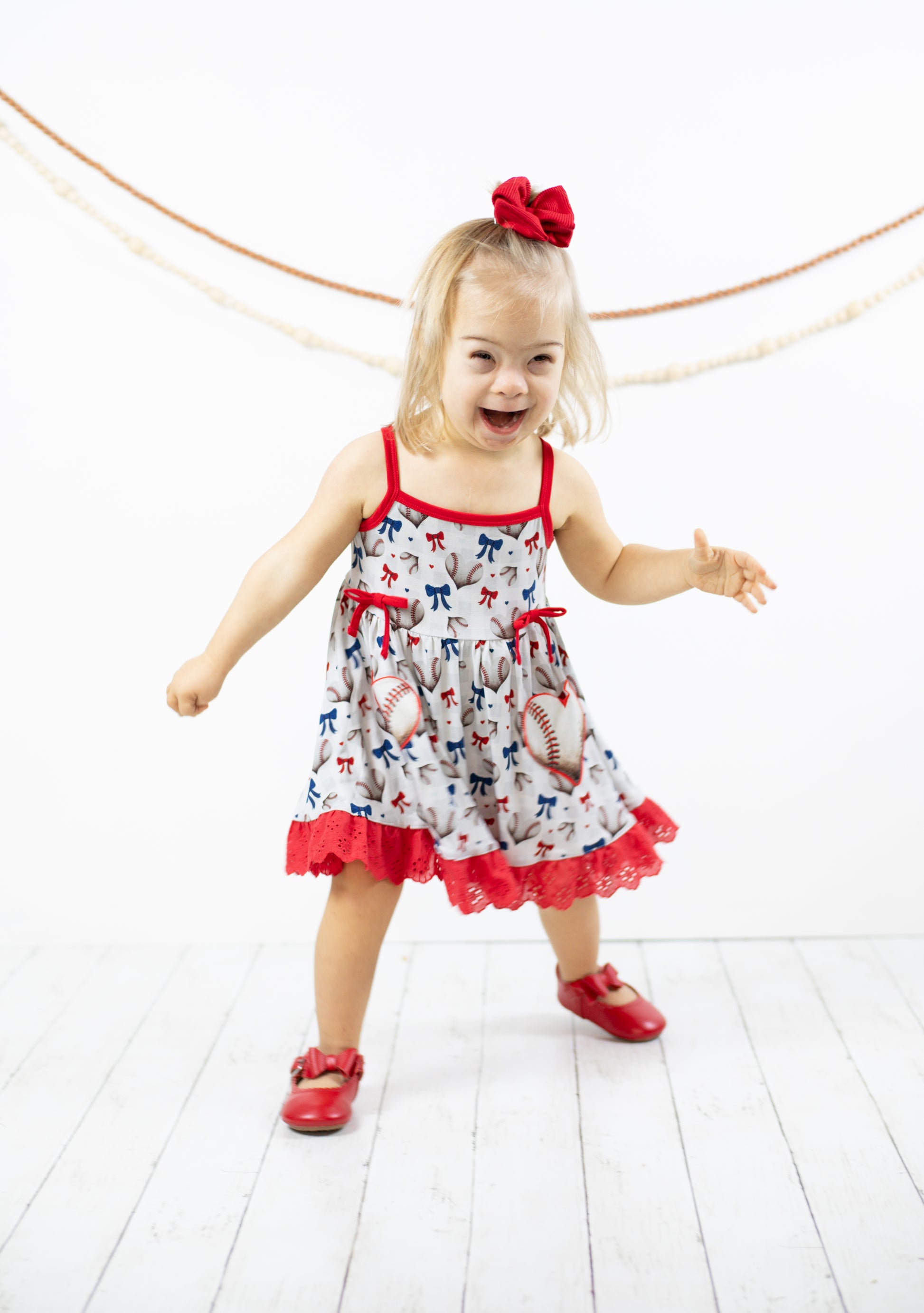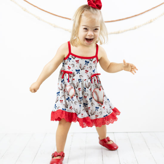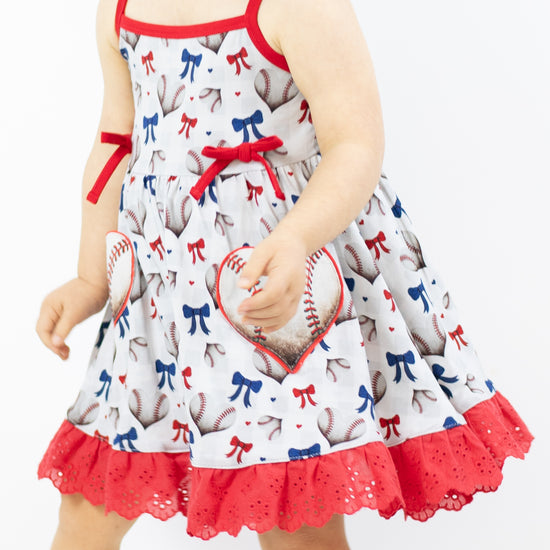 Play ball with a side of love in our Sweetheart Slugger design! This softball Valentine's print hits it out of the park with heart-shaped baseballs. Red and blue bows tie up the sweetness in sports; it's the perfect combo of America's favorite pastime meets Valentine's Day romance - because baseball fans have heart! Ideal for little sluggers who love the game and aren't afraid to wear their hearts on their sleeves this Valentine's + game season. You go girls!