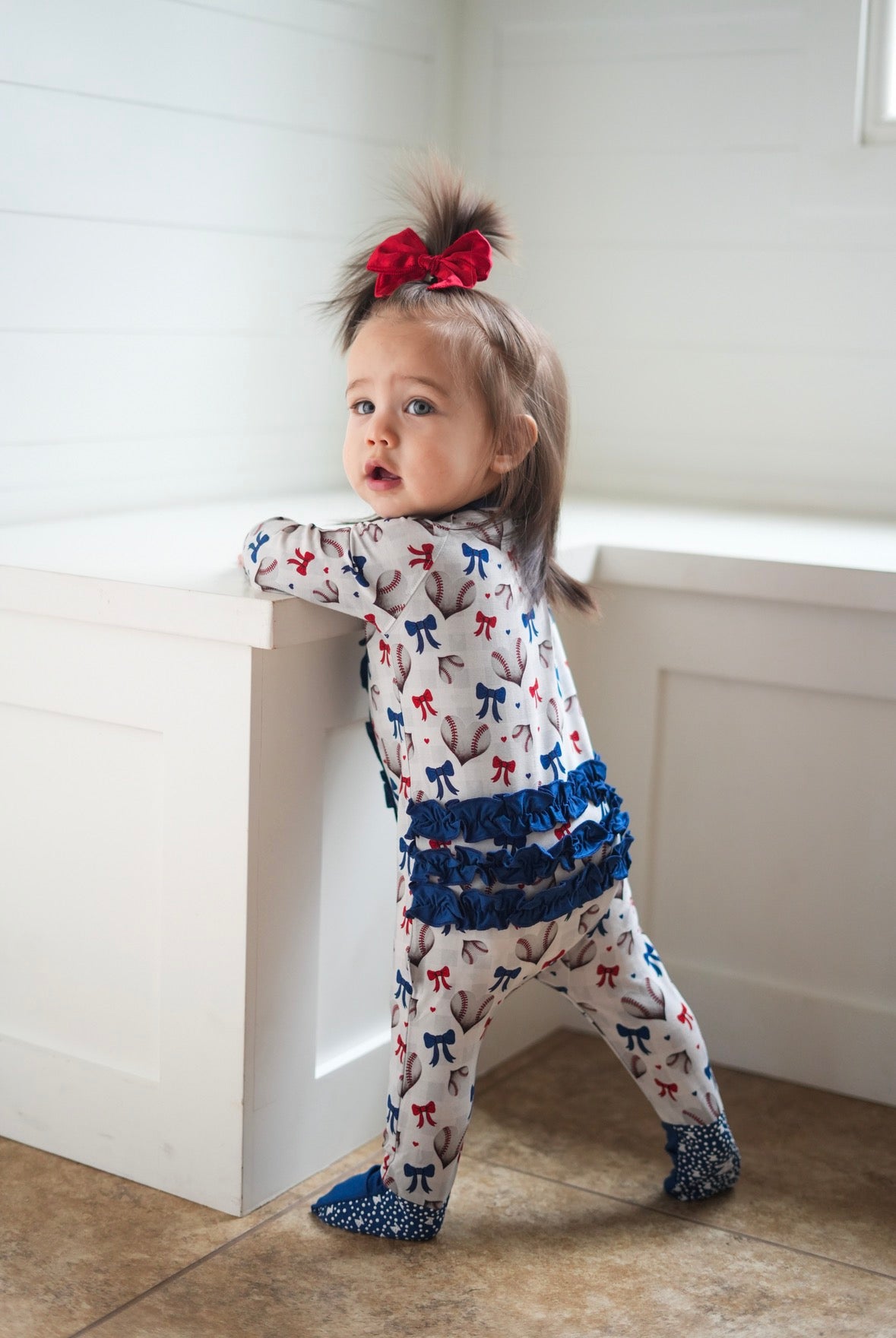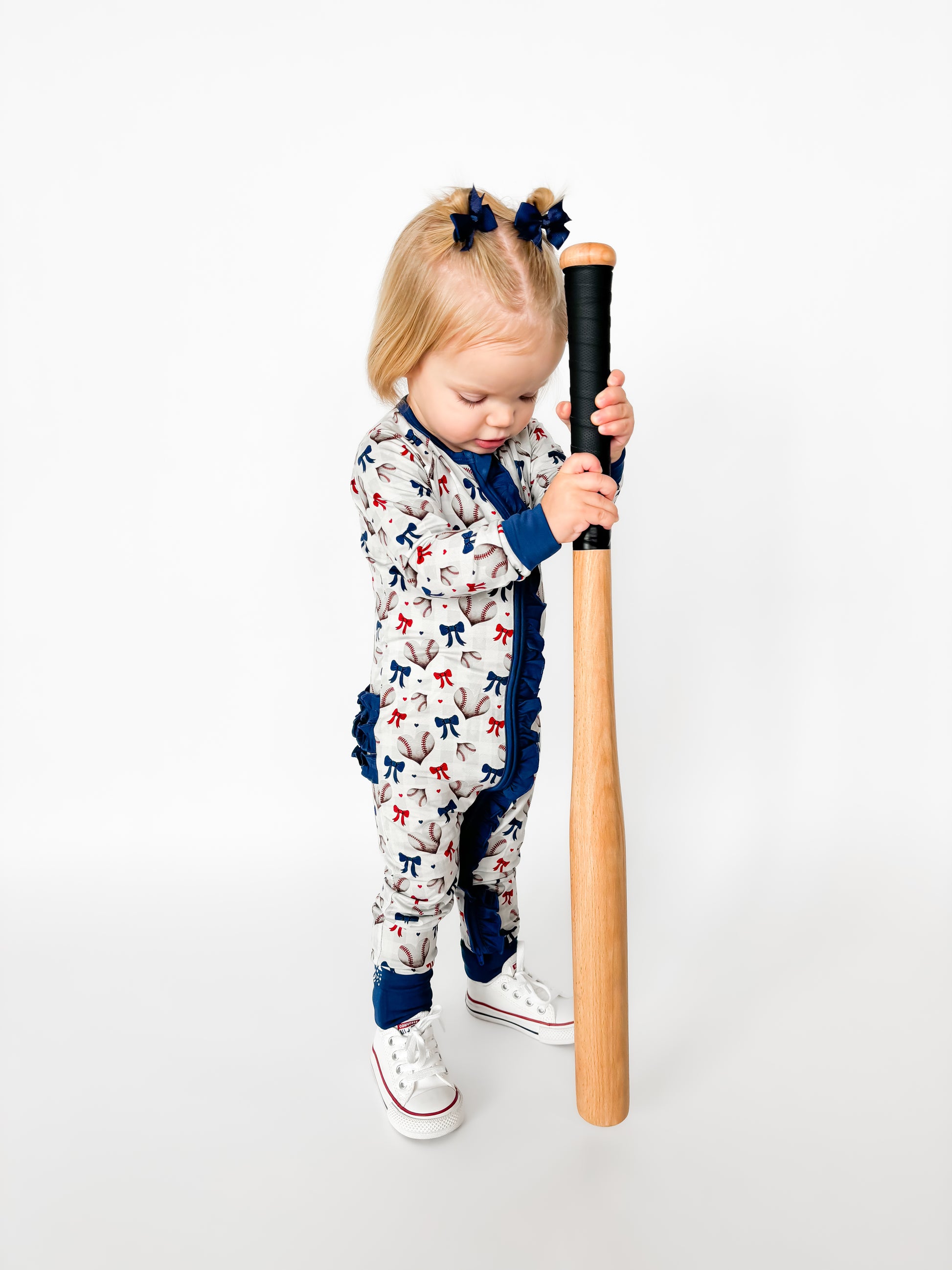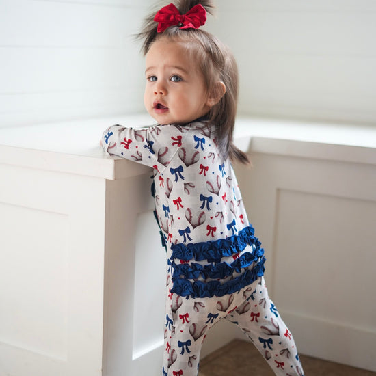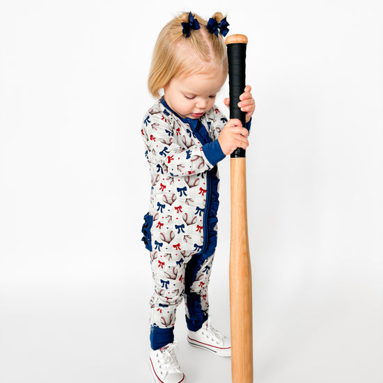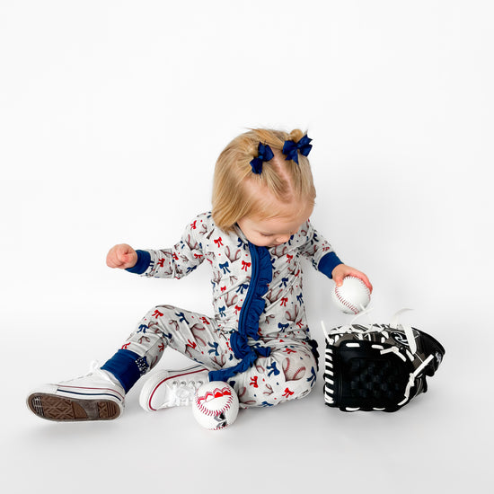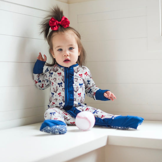 Play ball with a side of love in our Sweetheart Slugger design! This softball Valentine's print hits it out of the park with heart-shaped baseballs. Red and blue bows tie up the sweetness in sports; it's the perfect combo of America's favorite pastime meets Valentine's Day romance - because baseball fans have heart! Ideal for little sluggers who love the game and aren't afraid to wear their hearts on their sleeves this Valentine's + game season. You go girls!