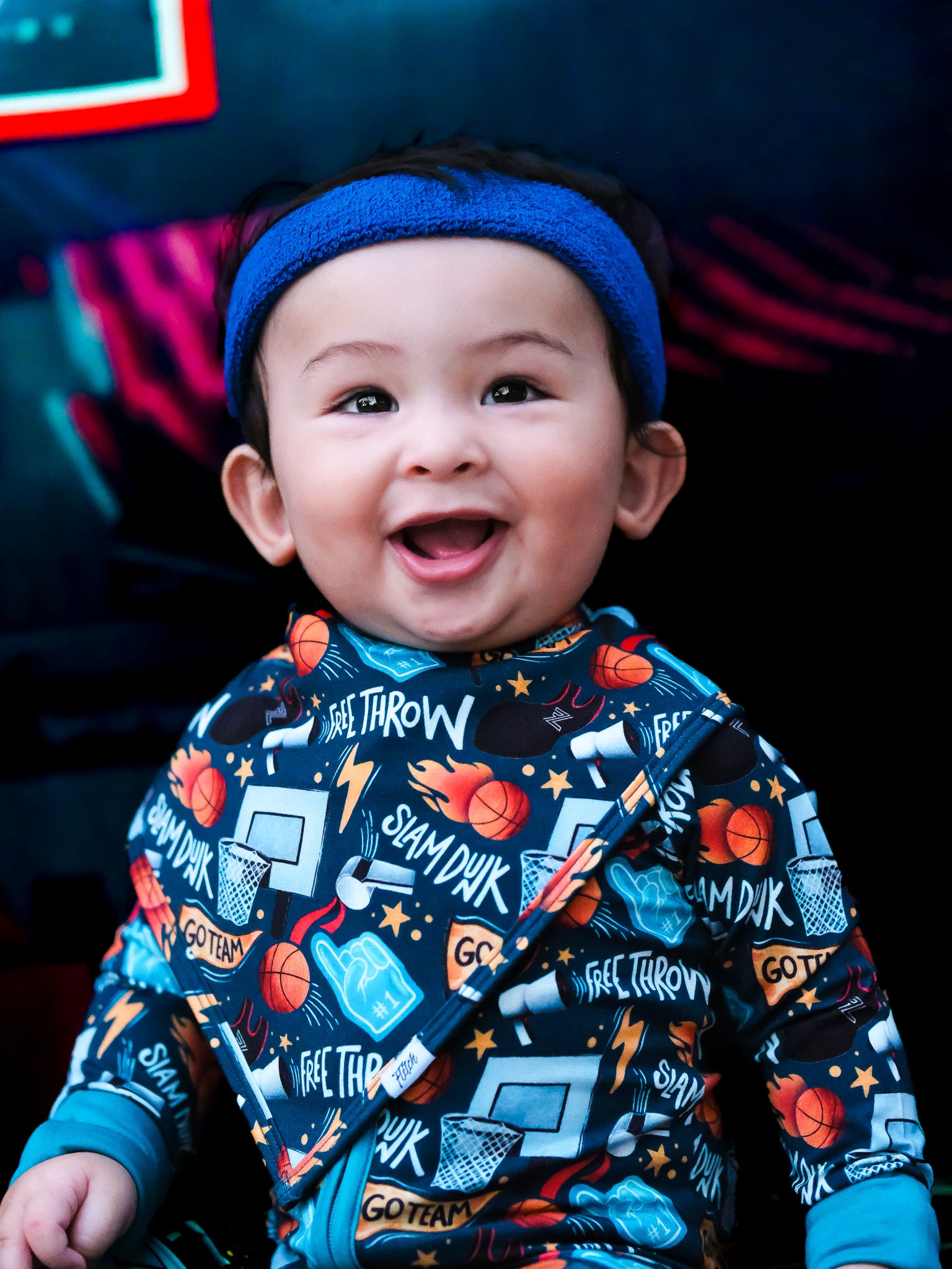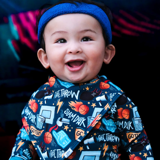 Swish mode activated! This rad all-over print brings serious street vibes with basketballs, hoops, and sports game graphics that will make your kiddo feel like a champion on the court. Featuring balls, nets and lightning bolts, these stars & city elements make this design epic for any little baller ready to shoot their shot in style and slam dunk. Game on team!