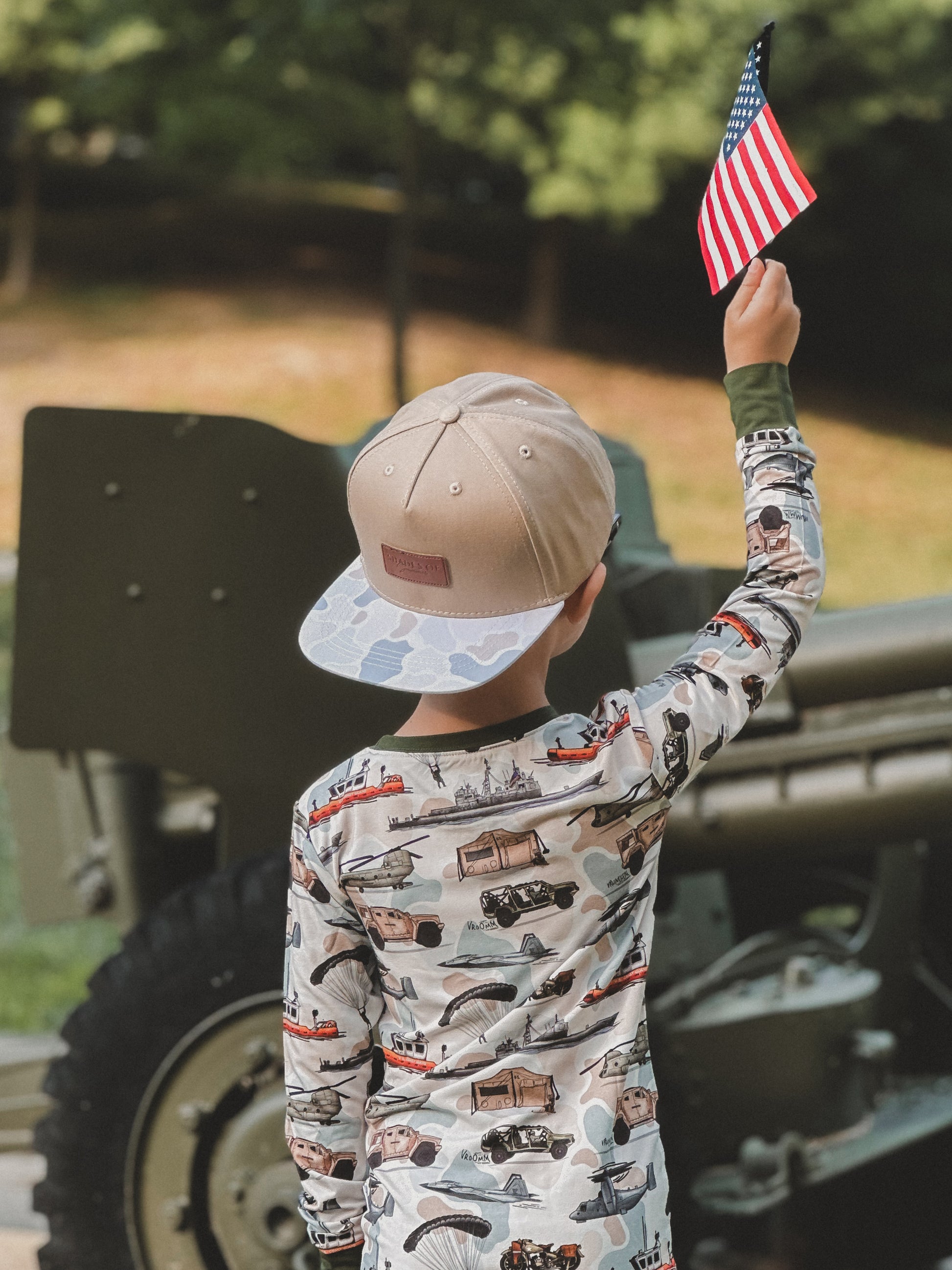 Salute your Military Heroes in this unique print that features coast guard, army tanks, fast vehicles, combat aircraft and much more. Army, Navy, Air Force, Marines, or Coast Guard- the patriotic family and veterans love this print. This design is set in a desert background to show support to those braves that have served. Go red, white, and blue!