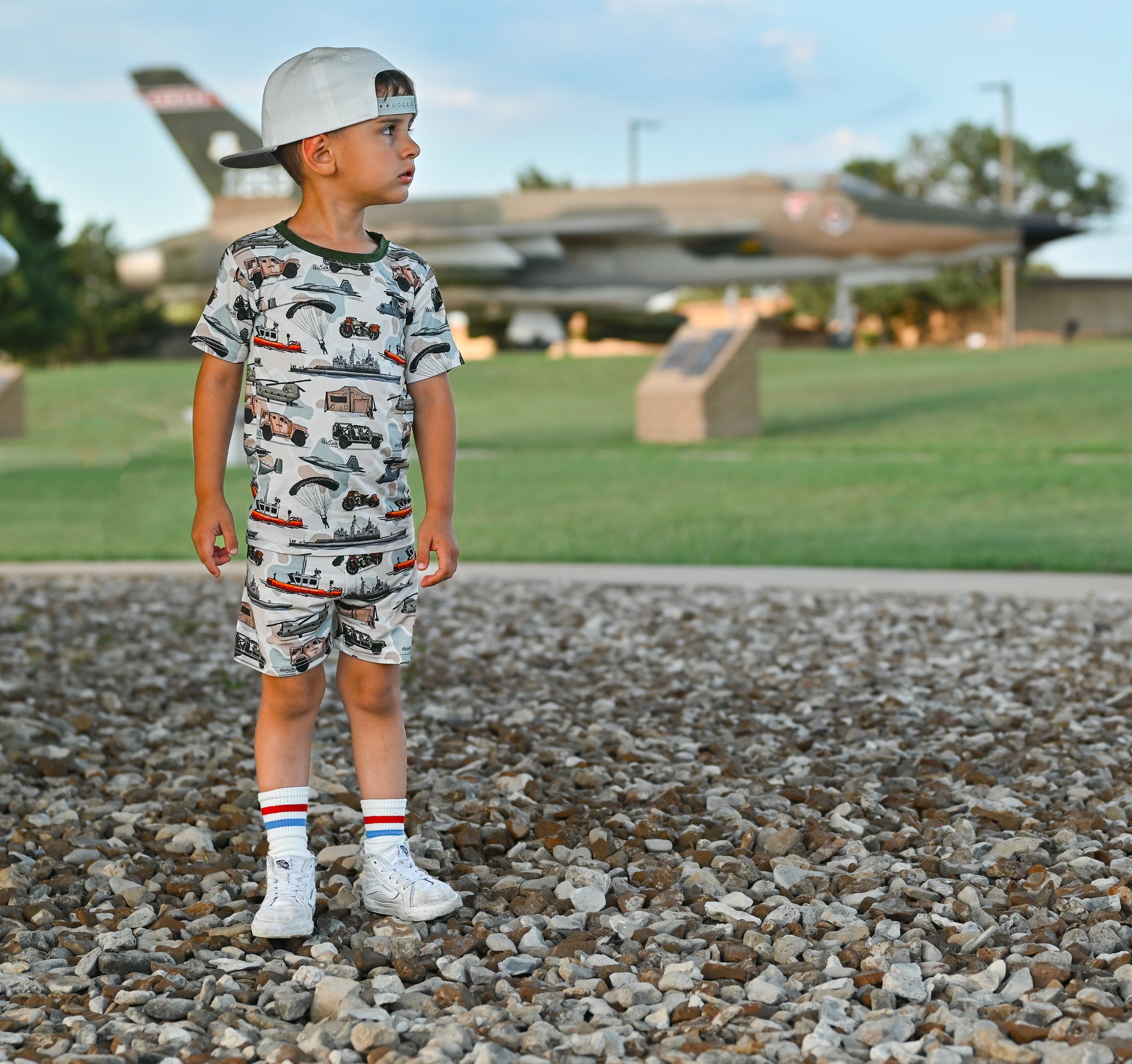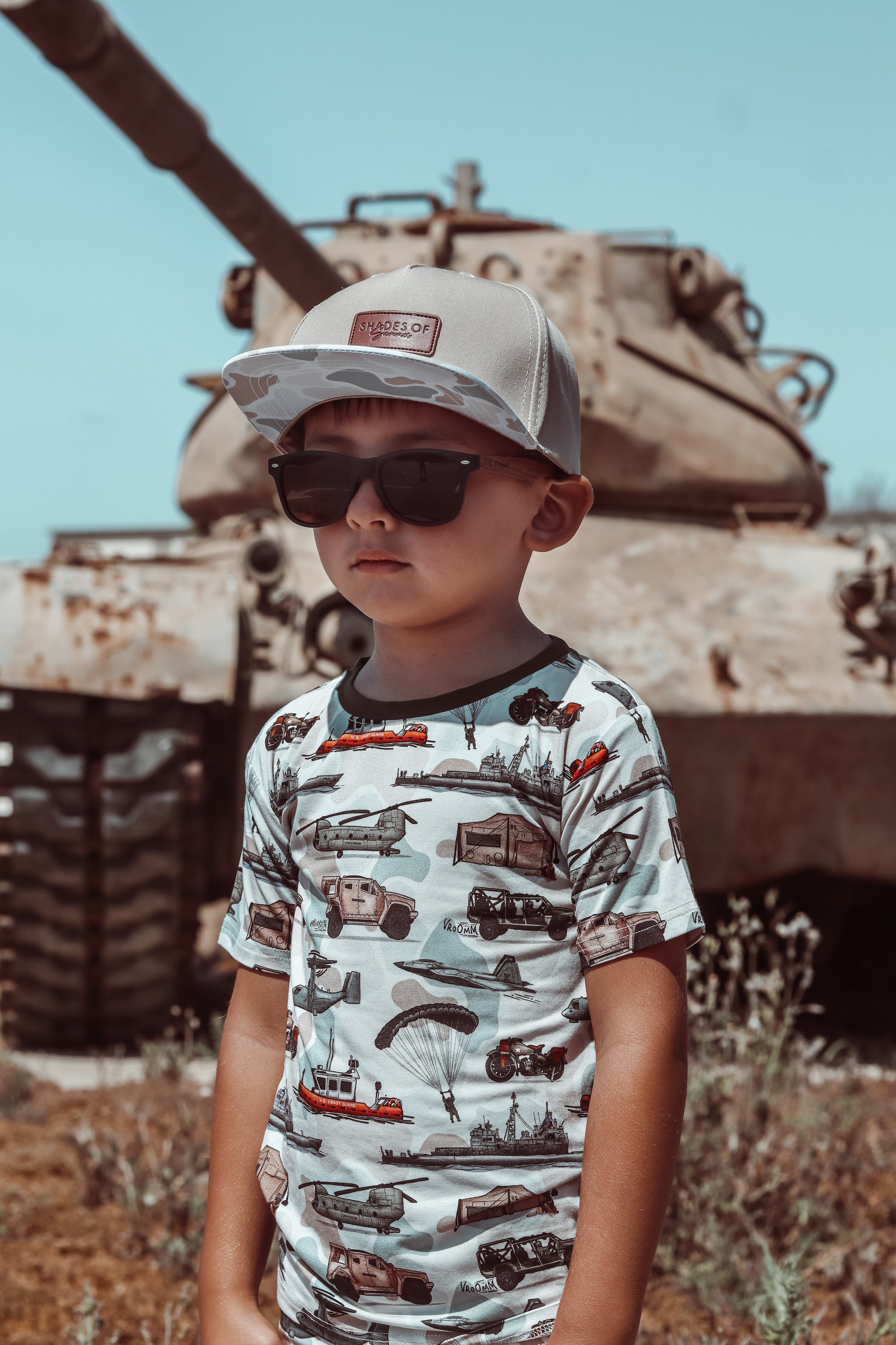 Salute your Military Heroes in this unique print that features coast guard, army tanks, fast vehicles, combat aircraft and much more. Army, Navy, Air Force, Marines, or Coast Guard- the patriotic family and veterans love this print. This design is set in a desert background to show support to those braves that have served. Go red, white, and blue!
