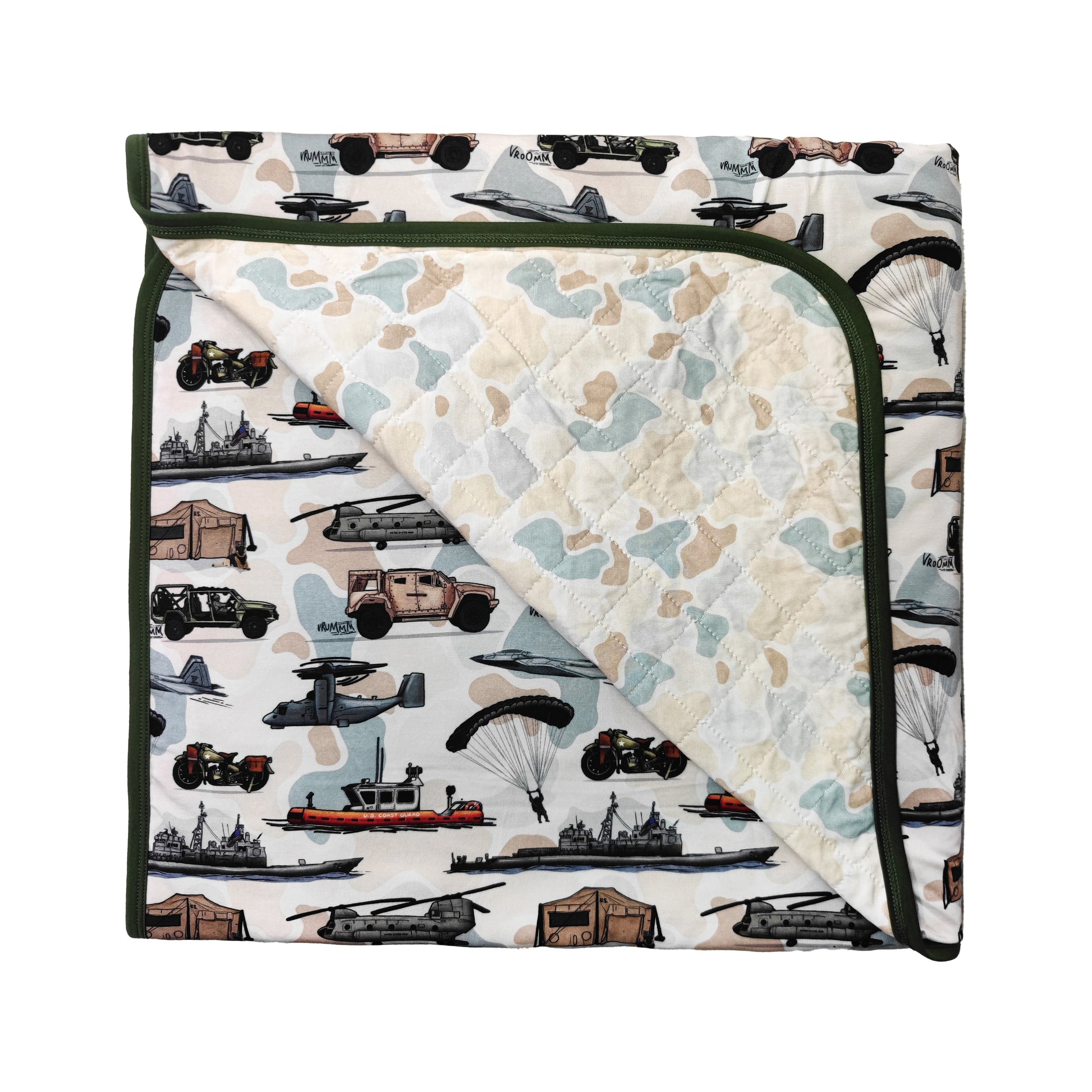 Salute your Military Heroes in this unique print that features coast guard, army tanks, fast vehicles, combat aircraft and much more. Army, Navy, Air Force, Marines, or Coast Guard- the patriotic family and veterans love this print. This design is set in a desert background to show support to those braves that have served. Go red, white, and blue!