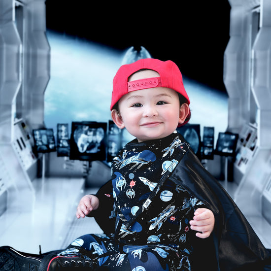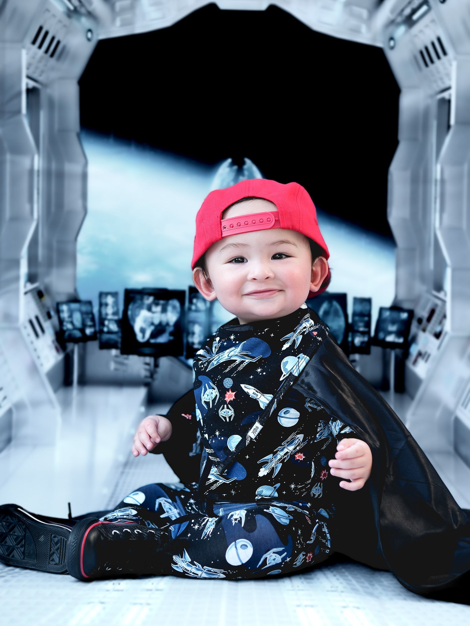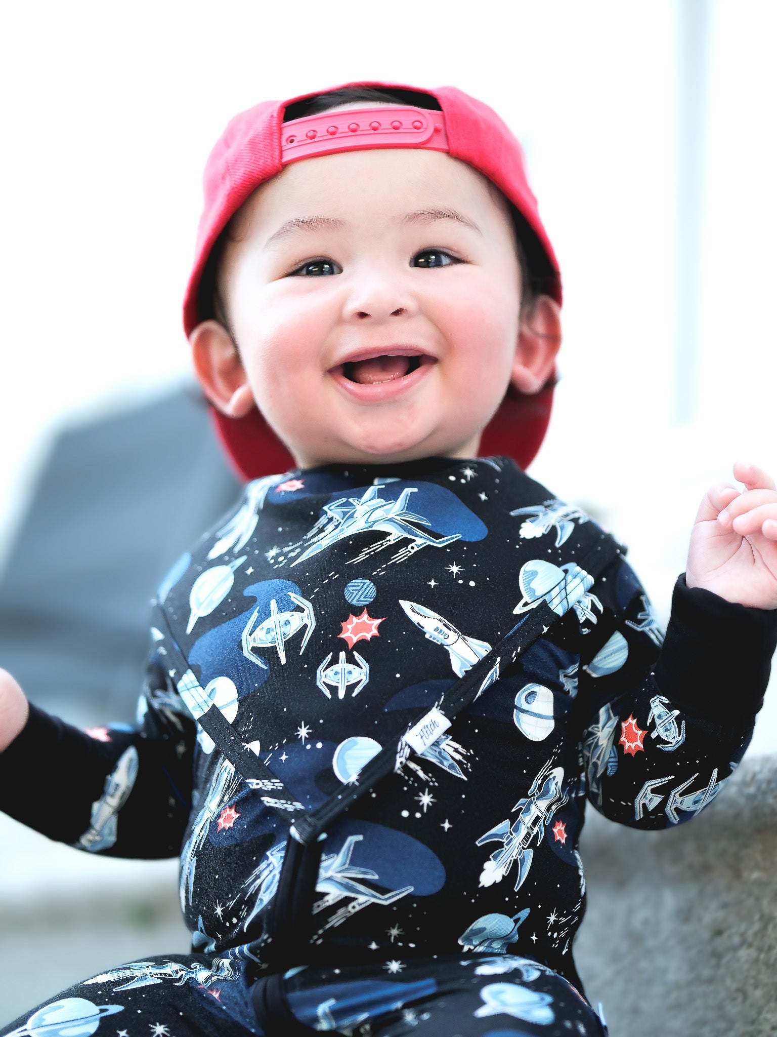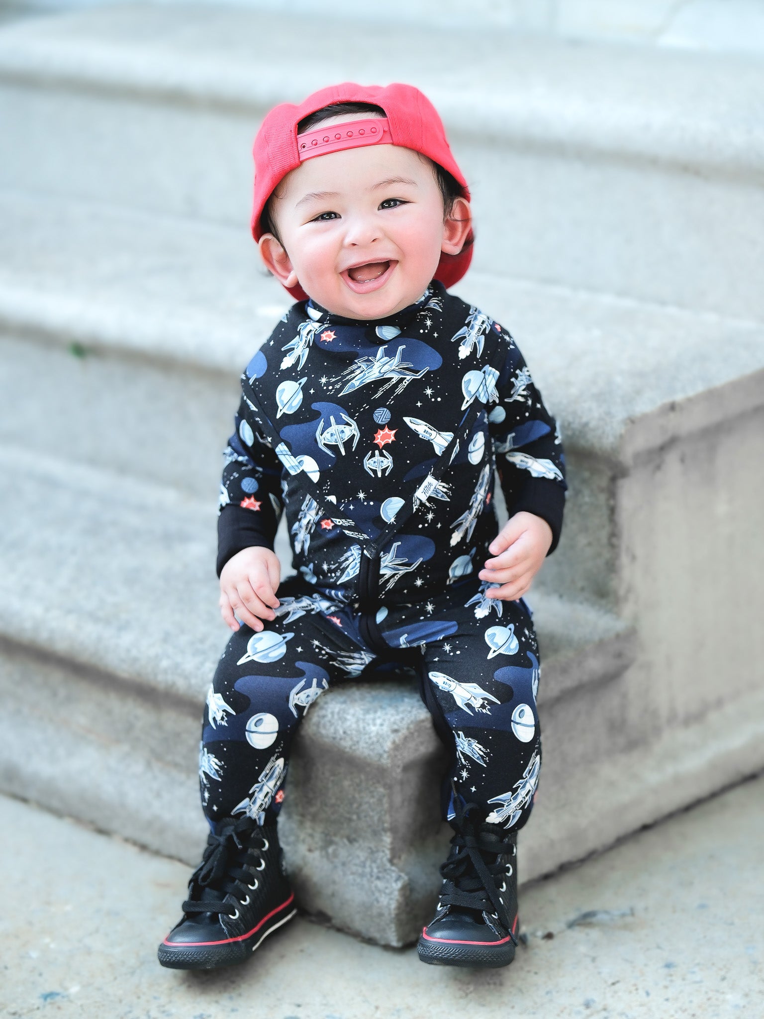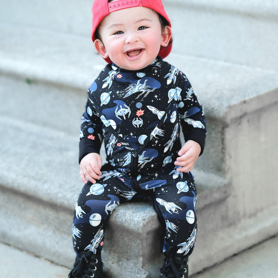 Blast off into outer space adventures! This rad glow-in-the-dark space print features rockets, cool planets, and spaceships zooming across a cosmic starry night. With red flames from the rocket ships, blue planets, and intergalactic vehicles, this design is perfect for any little astronaut ready to explore the most rad corners of the universe!