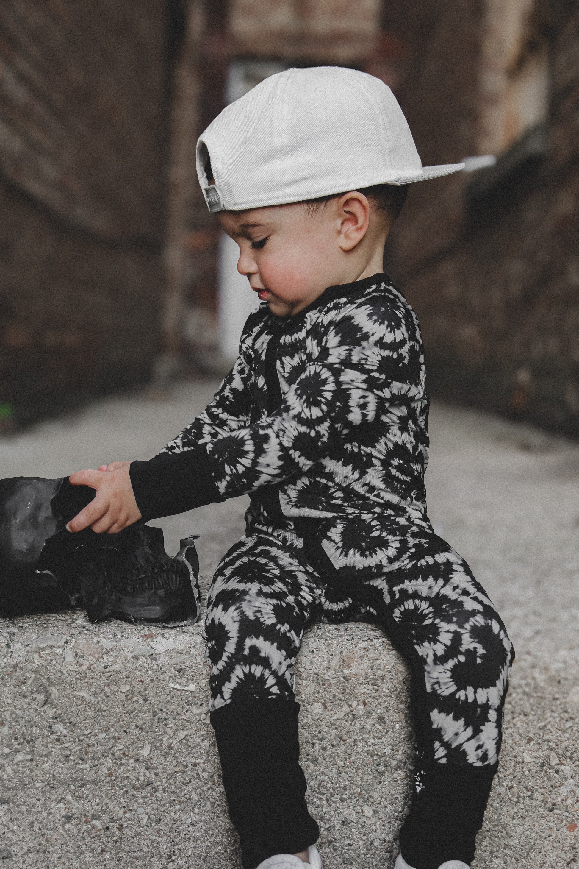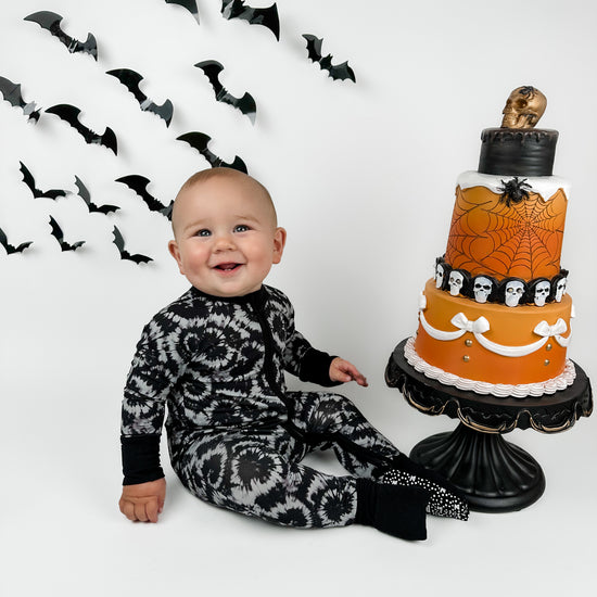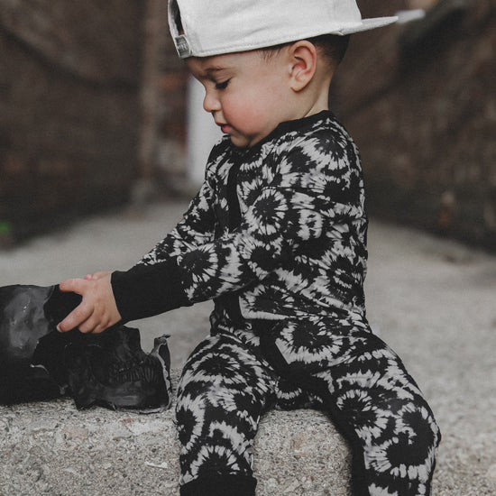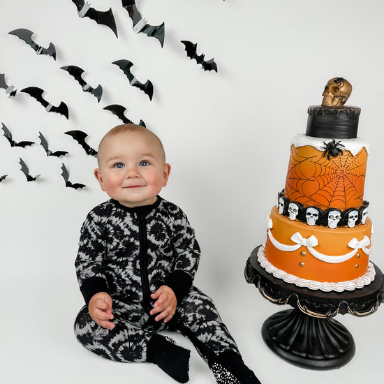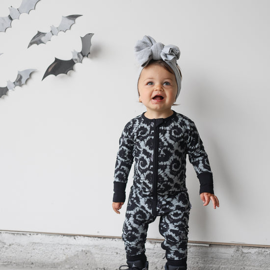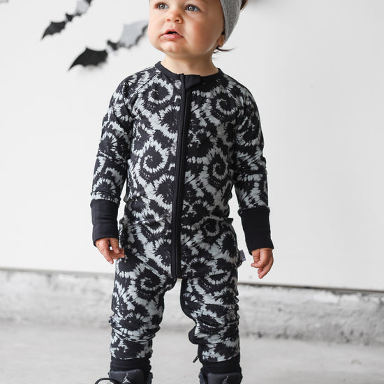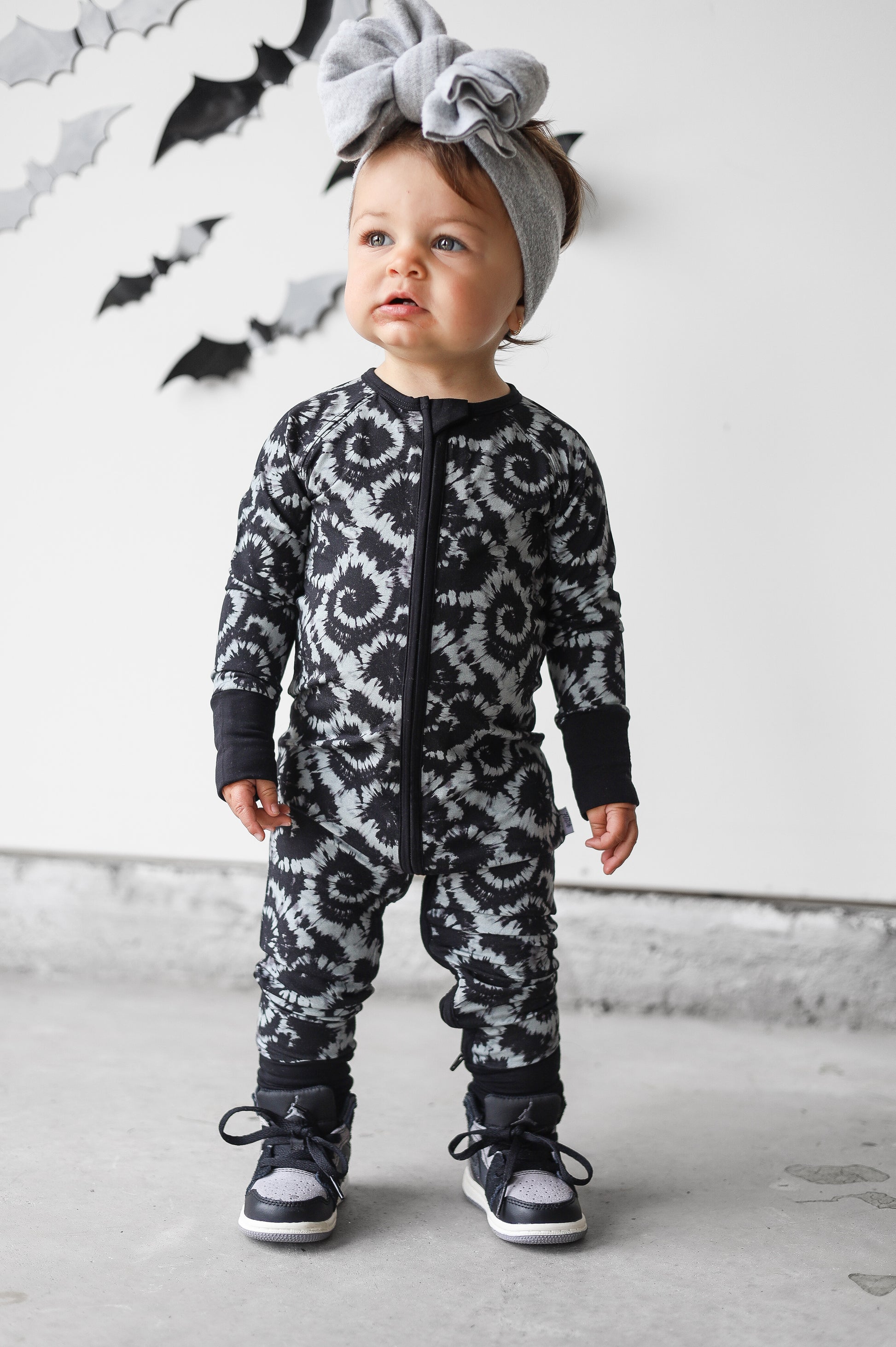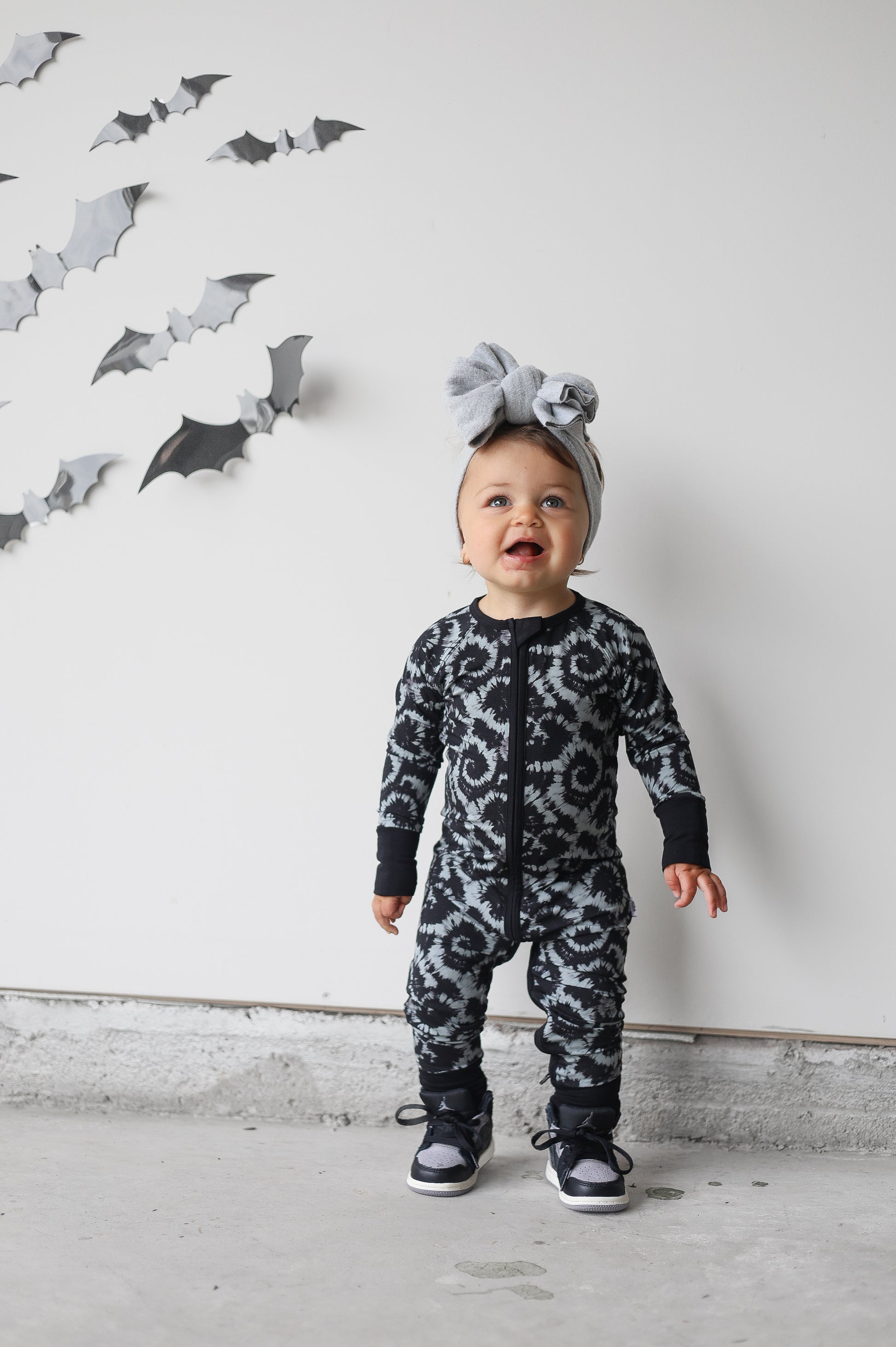 This tie-dye design is absolutely killer! The swirled gray and black pattern's so rad, any little dude/dudette will feel the swirl of epic Halloween vibes. It's tie-dye for!