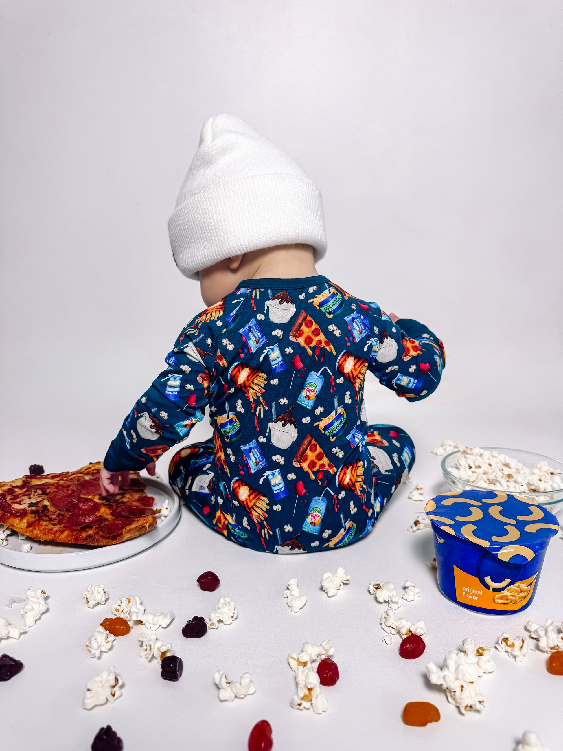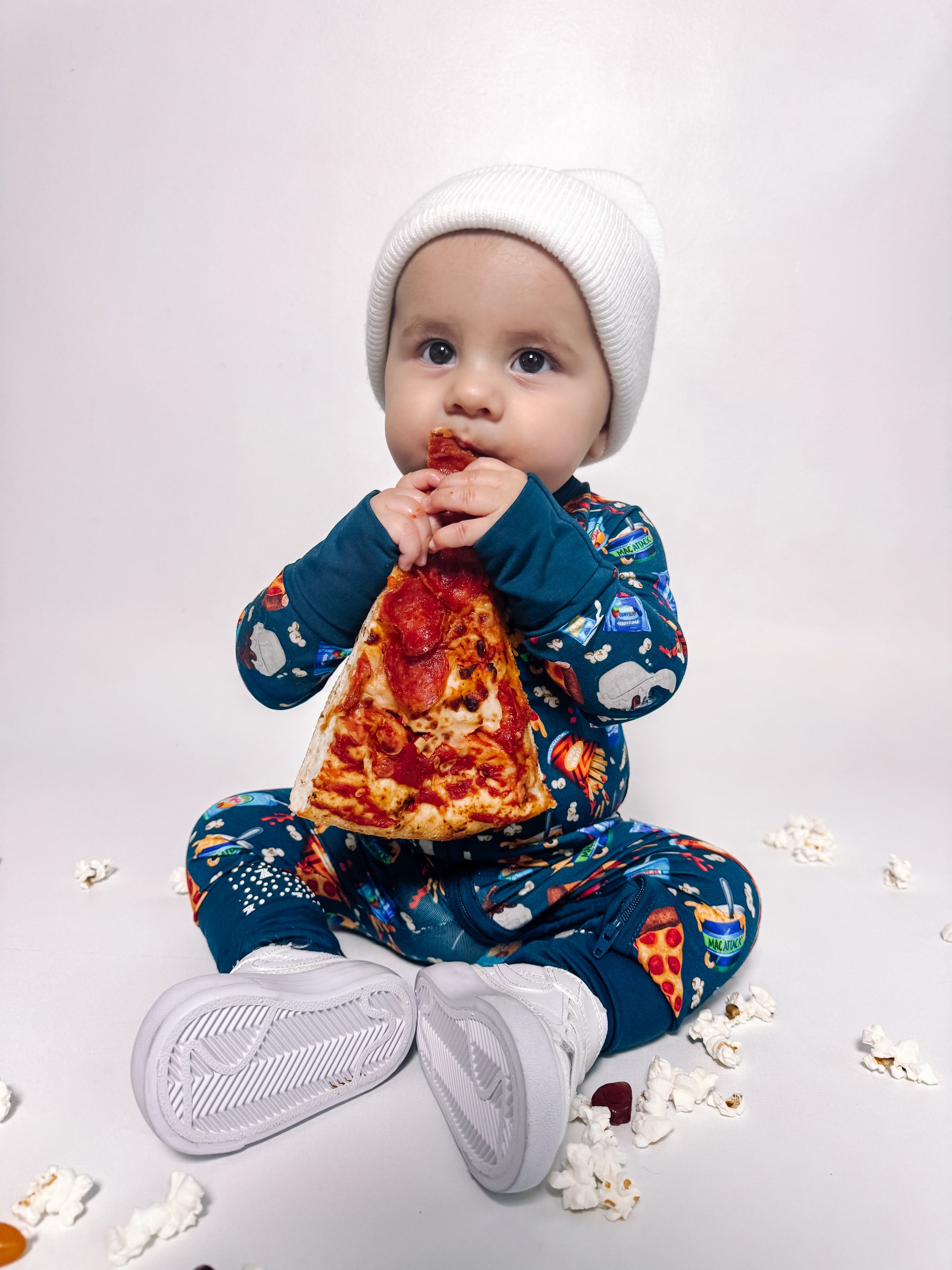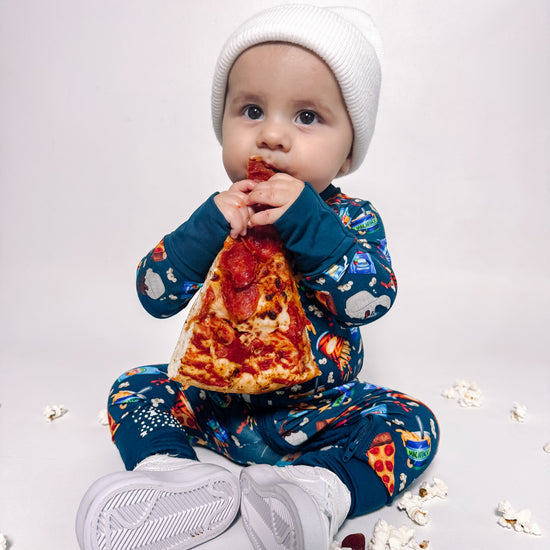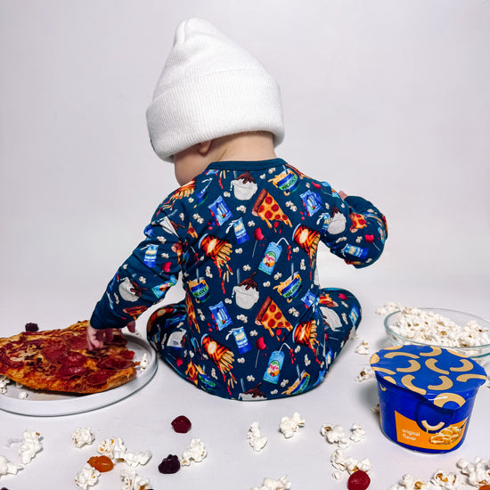 Let's get this snack party started! This epic food groups print serves up all the favorites; pizza slices, golden fries, epic burgers, and icy popsicles make this design a treat. Get popcorn ready for movie night, and cookies perfect for little foodies who appreciate the important food groups - you know, the delicious ones! This playful print brings that carnival, movie theater, and backyard BBQ energy all in one rad design.
