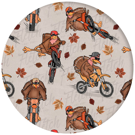 Dirt bike dreams come alive with this action-packed motocross print! Thanksgiving turkey riders catch major air with autumn leaves and fall vibes on their motorcycles. Race into the cozy spirit of fall on wheels. Gobble & rev those engines!