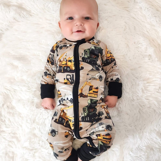 This print features a pattern of various construction vehicles in a neutral beige/ tan background. Our design includes: mobile cranes with extendable booms, utility trucks with bucket lifts/ cherry pickers, bulldozers/ excavators with forklifts, and multiple kinds of pickup trucks. Truck obsessed boys and girls will love this print in a bamboo pj set or convertible footie pajamas. Get constructive in this print from our Core Collection - a perfectly engaging design for little ones just beginning to recognize and identify different types of construction trucks and vehicles.